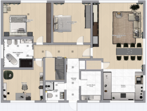 Zatwierdzona przez inwestorów koncepcja aranżacji wnętrz budynku dla realizacji Inwestycji „BUDOWA BUDYNKU MIESZKALNEGO JEDNORODZINNEGO W BOTOWIE , GMINA BISKUPIEC”. Poniżej przedstawiono koncepcję aranżacji na rzucie parteru, a następnie formę wizualną z podziałem na pomieszczenia.